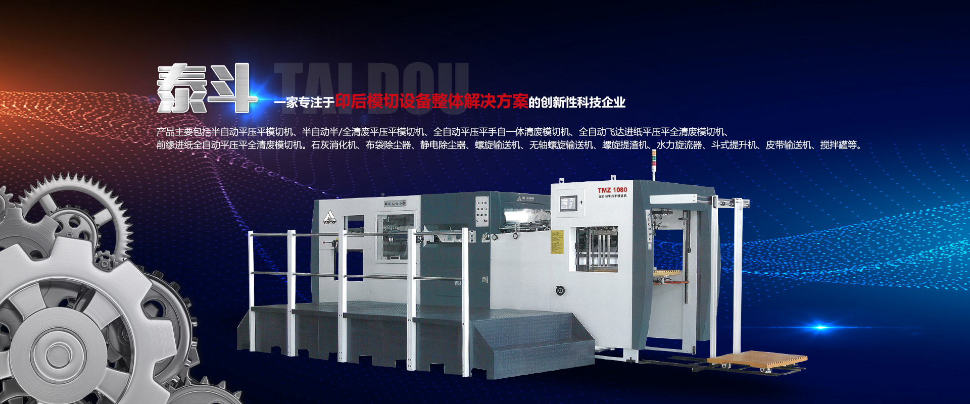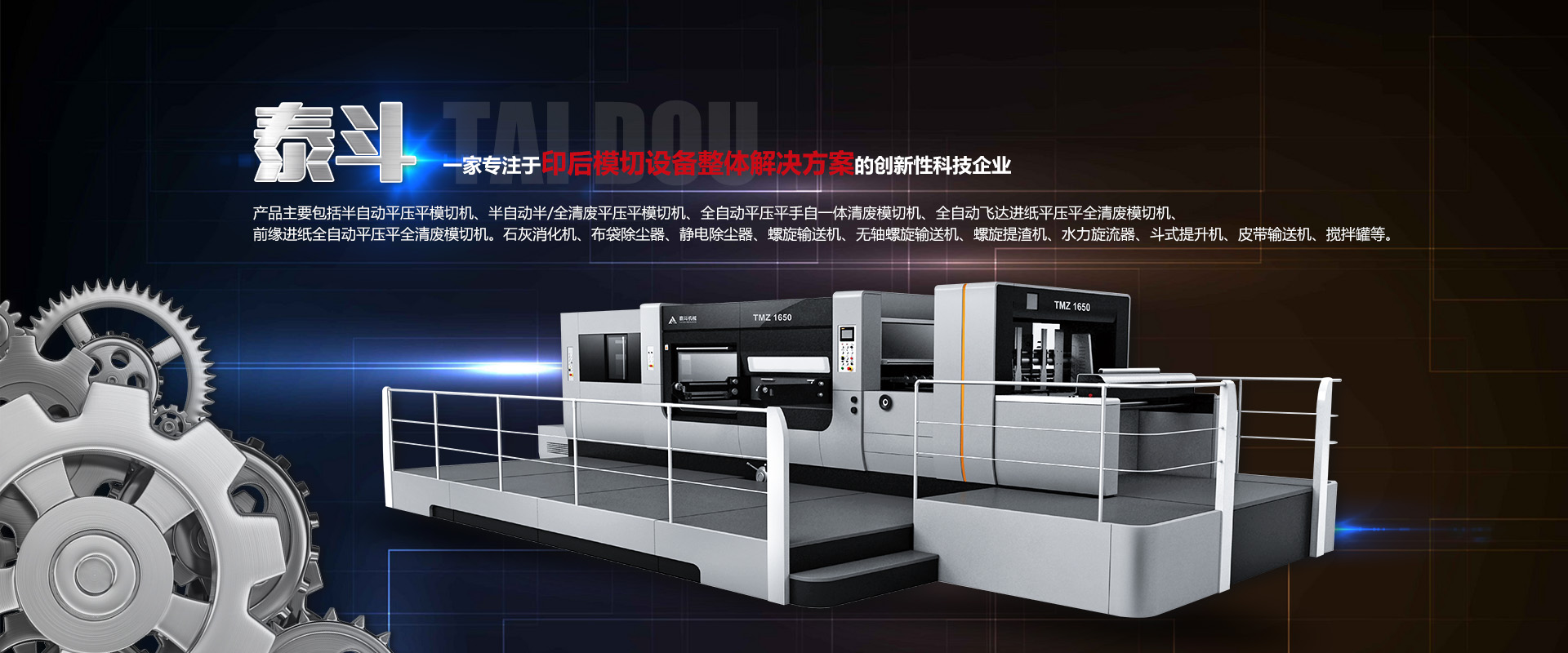 山东泰斗机械有限公司始建于2009年3月,是一家专业提供印后模切设备整体解决方案的创新型科技企业,工厂座落于山东省安丘市经济开发区,公司占地2万多平方米,现有员工280人,专业科研人员36人,高级技术职称12人。公司坚持客户需求至上,市场升级的发展思路,为客户提供适用、高效的设备,产品主要包括半自动平压平模切机、半自动半/全清废平压平模切机、全自动平压平手自一体清废模切机、全自动飞达进纸平压平全清废模切机、前缘进纸全自动平压平全清废模切机。
